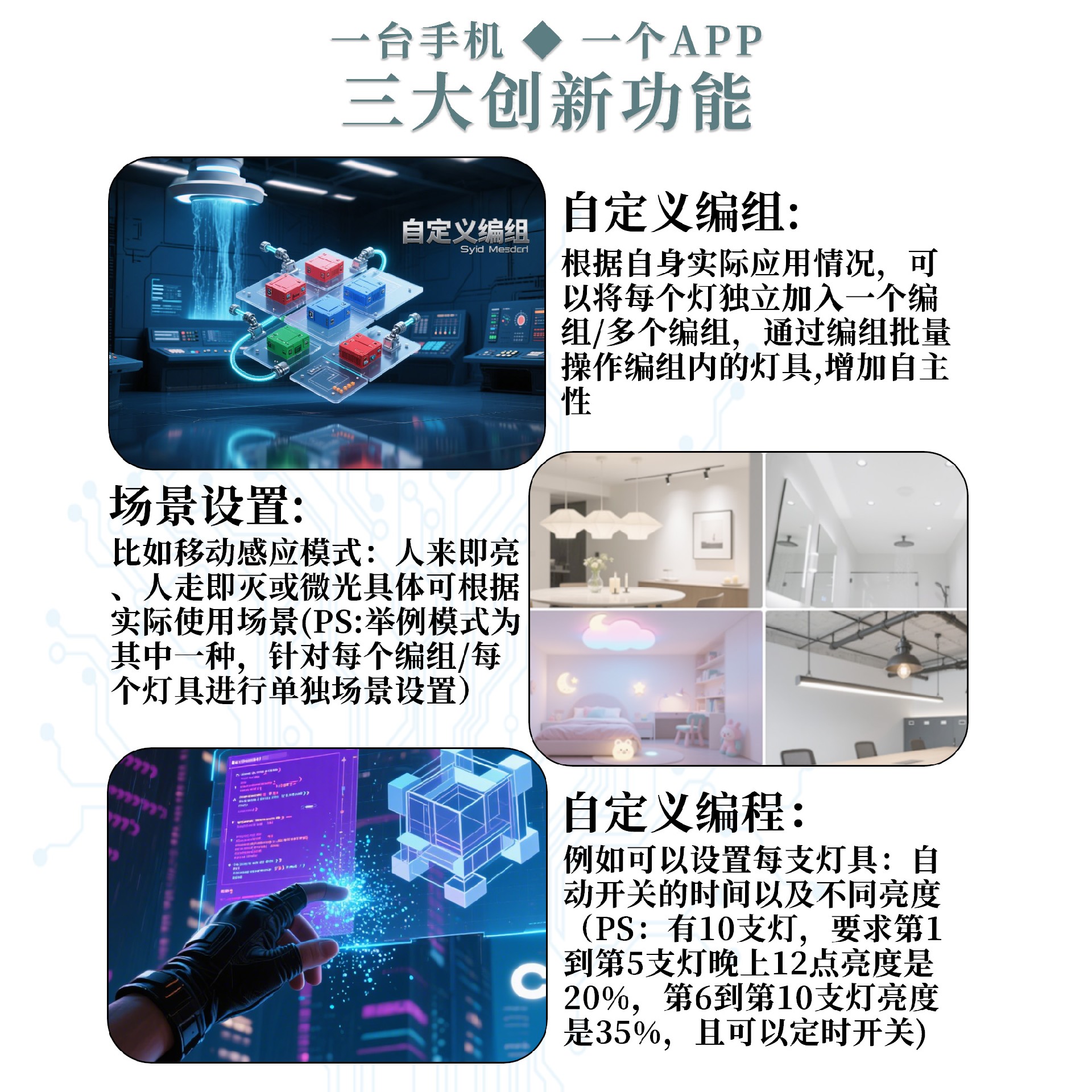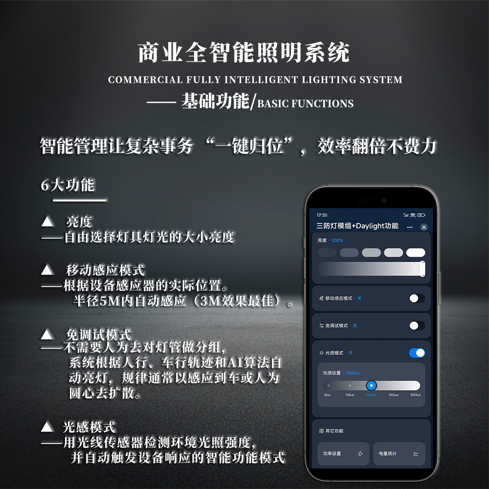 远程智控,跨越空间:即便身处异地,也能通过手机远程操控灯具。下班途中突然想起客厅灯未关,或是发现办公室的灯光还亮着,甚至是想要根据停车场的实时情况调节亮度,只需在手机上轻轻一点,即可轻松解决,随时随地为你省心省力。